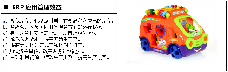 玩具行业已成为我国出口五大支柱商品之一,中国玩具市场上约有产品3万多种,按大类分主要有电子类、机械模型类、塑胶玩具、木制玩具等。内地玩具市场规模庞大发展迅速,上升空间巨大,随着城市居民收入提高、生活质量的改善,内地居民对玩具的需求已开始从传统的、中低档次的电动型、拼装型、装饰型玩具转向新颖的电子型、智慧型玩具及高档的毛绒、布制类装饰型玩具。为了应对更加激烈的竞争,企业的信息化管理必不可少。