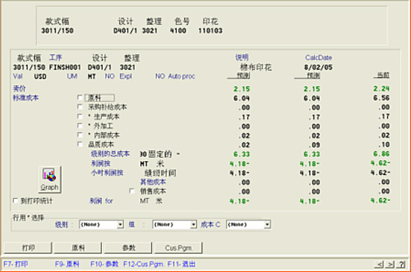 纺织行业系统还提供了非常详细的成本分析功能。接订单之前,系统可以进行价格估算。工艺做好之后,给出加工成本预算。加工过程之中以及加工之后,给出实际加工成本以及成品率分析。TIM系统的成本分析,在系统的后台不断的进行着运算,每一次出库,入库,废品处理,加工进度更新,回修和补单生产,都在更新着成本。成本计算细致到了加工中的每一个批量,每一个车间,每一个成本元素(水,电,汽,挡车工,管理人员,生产辅助人员,利息成本),在生产中的每一个阶段,等待,上机调试过程,正常运转,停机处理等。给企业精细化管理,6希格玛管理,精益生产,降低经营风险,提高管理水平,提供非常强有力的工具。